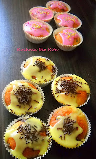 Tu muffinki z lukrem i posypką cukrową, niżej z pastylkami czekoladowymi: